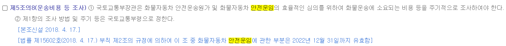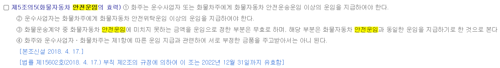 2018년 화물자동차 운수사업법 개정을 통해 만들어진 안전운임제 화물 차주 즉 화물 기사들에게 적정한 운임의 보장을 위해 만들어진 제도로 납기를 맞추기 위해 과로한 상태로 과적과 과속을 하는 기사들의 근무여건을 개선하고 안전한 사회를 만들기 위해 개정되었지만 20년부터 3년간 시행 후에 올해말 일몰될 예정입니다.