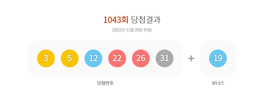 1043회 로또 당첨 등수별 당첨금은 아래와 같습니다. 1043회 로또 당첨번호는 3, 5, 12, 22, 26, 31 보너스번호 19번으로 나왔습니다. 당첨되신 분들께 축하 인사를 다시 한번 드립니다 정말 축하드려요.
