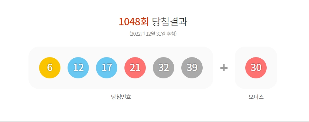 1048회 로또 당첨 등수별 당첨금은 아래와 같습니다. 1048회 로또 당첨번호는 6, 12, 17, 21, 32, 39 보너스번호 30번으로 나왔습니다. 당첨되신 분들께 축하 인사를 다시 한번 드립니다 정말 축하드려요.