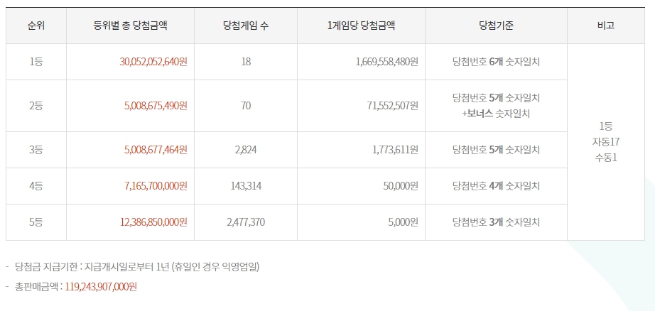 ▶1등 당첨금 - 1등 당첨자는 18명으로 각각 16억 6955만원