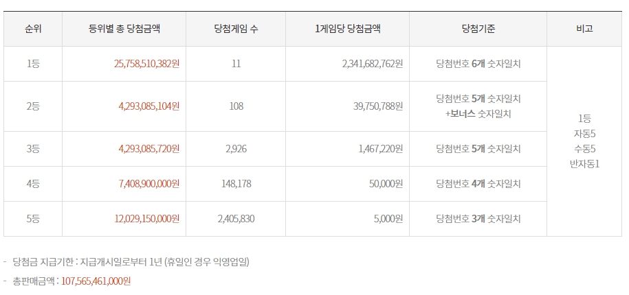 1등 당첨금 - 1등 당첨자는 11명으로 각각 2,341,682,762