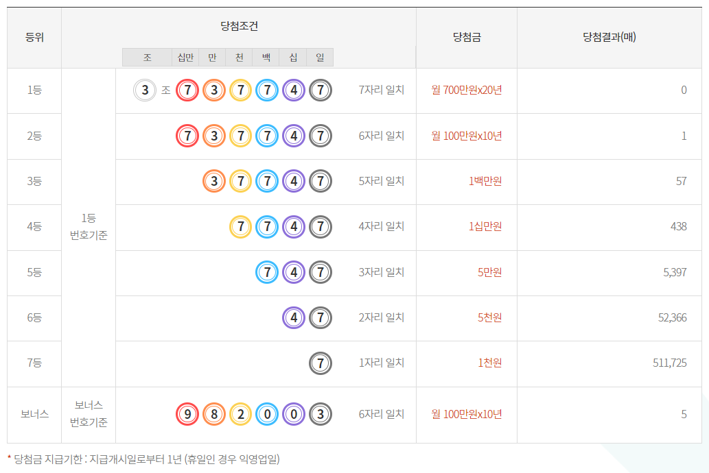 1등 당첨번호 : 3조 7 3 7 7 4 7
