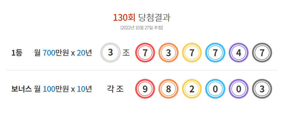 2022년 10월27일 목요일 130회 연금복권 당첨번호 추첨 방송이 진행되었습니다. 연금 복권은 아시다시피 1등과 2등 그리고 보너스 당첨자에게 매 달 당첨금을 연금식으로 분할 지급하는 연금식 복권입니다. 이번 포스팅에서는 130회 연금복권 당첨번호를 포함하여 등수별 당첨 인원과 세후 실수령액에 대해 알아보겠습니다