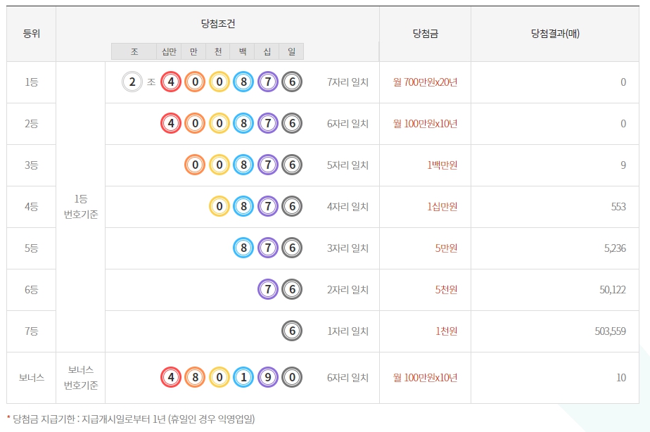 1등 당첨번호 : 2조 4 0 0 8 7 6