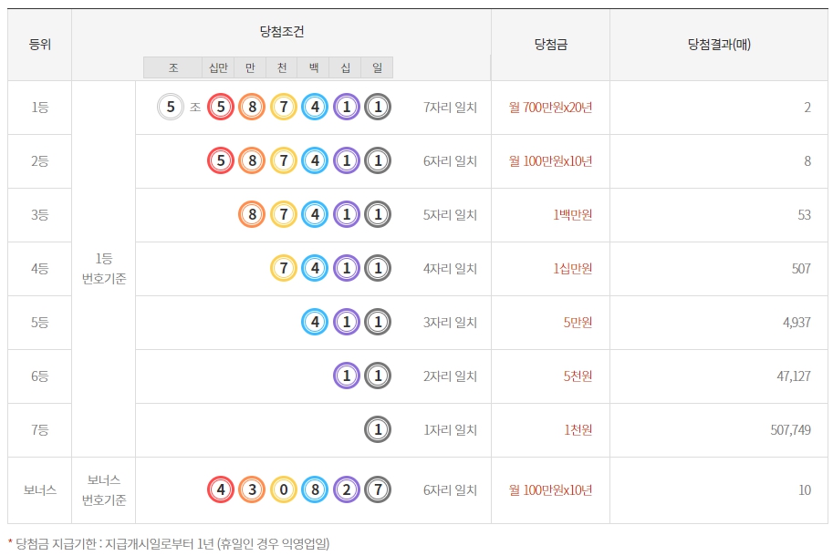 1등 당첨번호 : 5조 5 8 7 4 1 1