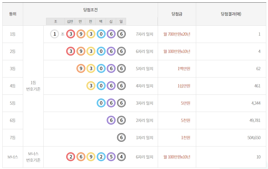 1등 당첨번호 : 1조 3 9 3 0 6 6