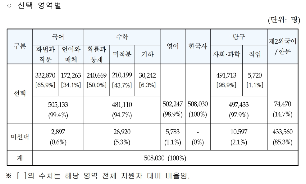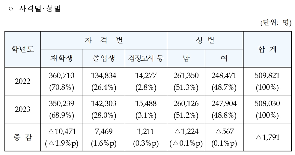 올해 수능 응시생은 약 50만명으로 집계 결과 작년 대비 약 0.4% 감소한 508,030명이 응시한 것으로 알려지고 있으며 재학생이 350,239명으로 68.9%, 졸업생이 142,303명으로 28%, 검정고시 등 기타 응시자가 15,488명으로 남성이 260,126명으로 51.2%, 여성이 247,904명으로 48.8%의 분포를 보이고 있습니다.