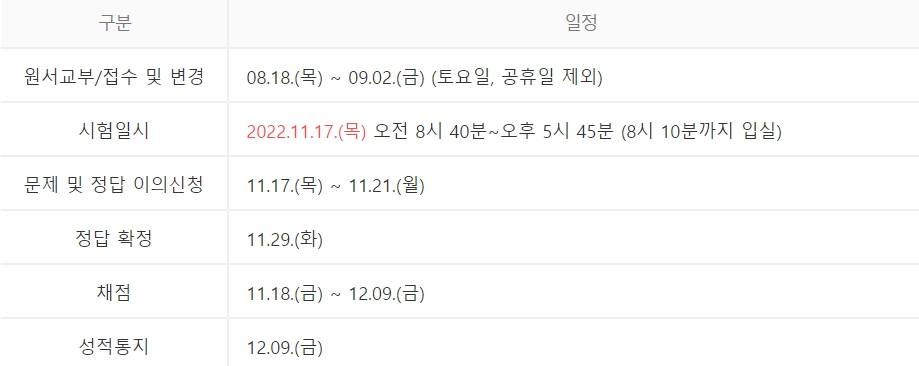 대개 수능시험 원서접수는 8월 중순에서 9월초까지 이어지는데 올해는 8월 18일부터 9월 2일 사이에 접수를 실시하였으며 2022년 11월 17일 목요일에 시험이 실시됩니다. 11월 17일 시험 당일부터 11월 21일까지 이의신청을 실시한 이후에 2022년 11월 29일 화요일 최종 정답을 확정하고 채점을 통하여 2022년 12월 9일 금요일에 성적이 통보될 예정입니다.