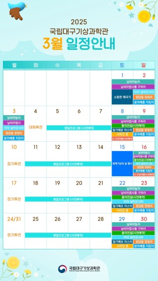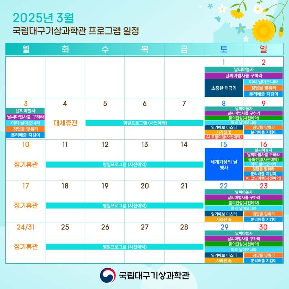 따스한 봄바람이 불어오는 3월, 대구에서 아이와 함께 나들이를 계획하고 있다면 국립대구기상과학관을 추천합니다. 과학에 대한 호기심을 자극하면서도 온 가족이 즐길 수 있는 다채로운 프로그램이 마련되어 있어 교육과 재미를 동시에 잡을 수 있습니다. 특히 이번 3월에는 세계 기상의 날 기념 행사부터 AI 코딩 체험, 특별 전시와 봄학기 날씨교실까지 다양한 활동이 기다리고 있습니다. 지금부터 국립대구기상과학관에서 즐길 수 있는 3월 프로그램을 자세히 살펴보겠습니다.