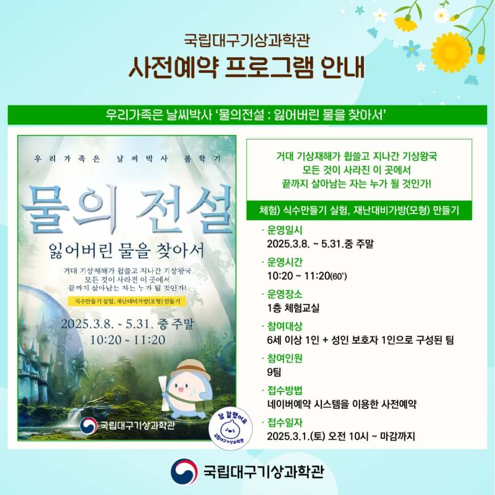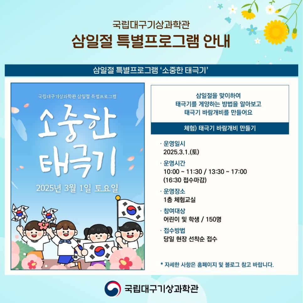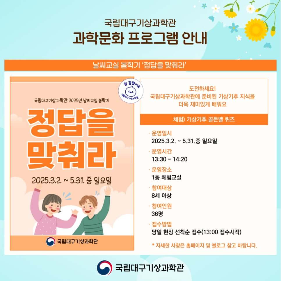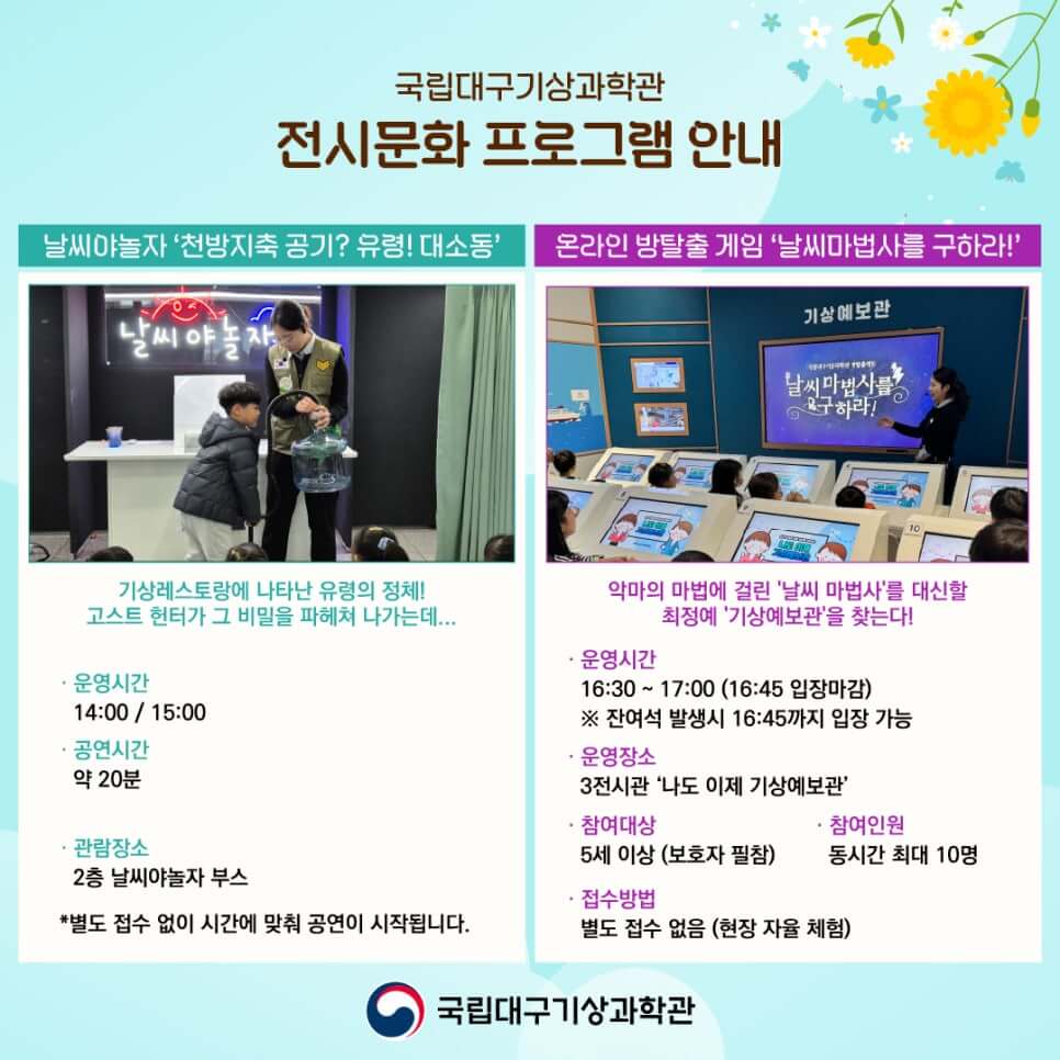 참여 방법: 각 프로그램별 현장 선착순 접수 또는 네이버 예약을 통해 사전 신청 가능하며, 자세한 사항은 국립대구기상과학관 홈페이지 및 블로그를 참고하면 됩니다.