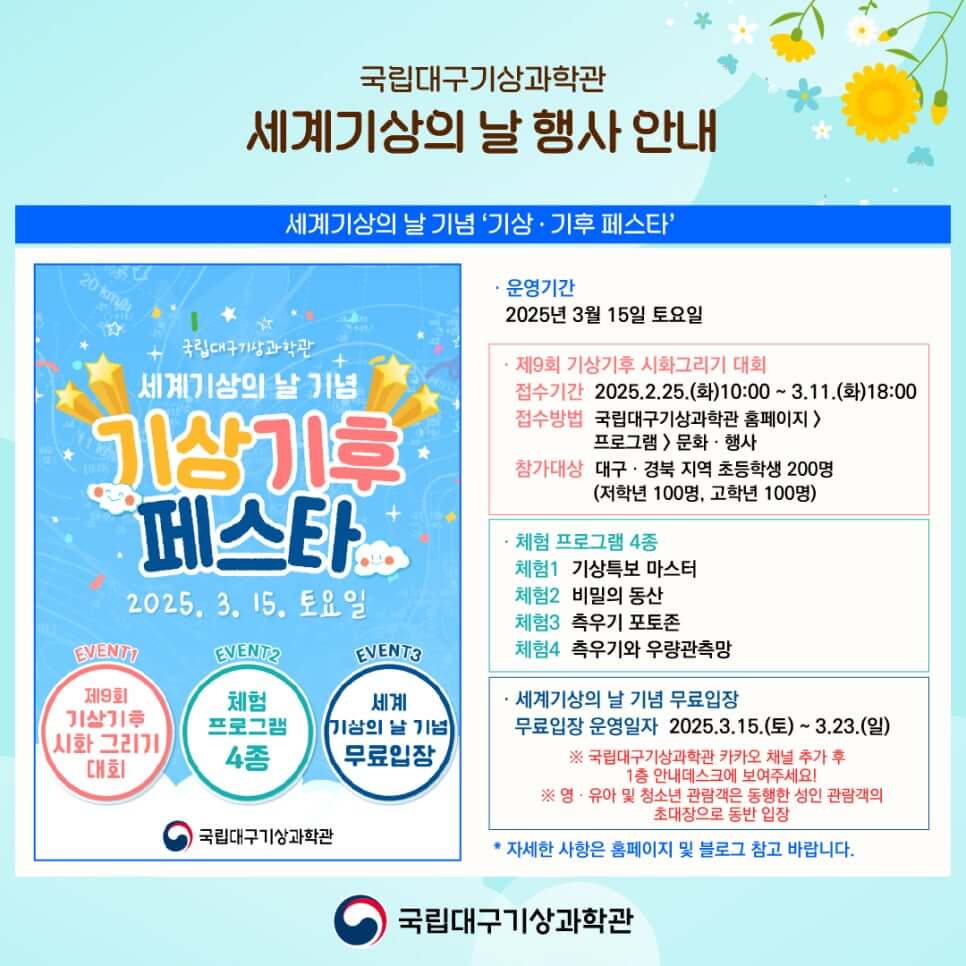 제 9회 기상기후 시화그리기 대회: 대구·경북 지역 초등학생을 대상으로 열리는 시화그리기 대회는 저학년과 고학년으로 나뉘어 200명의 참가자를 모집합니다. 아이들이 기후 변화와 환경 보호에 대한 생각을 그림으로 표현할 수 있는 기회입니다.