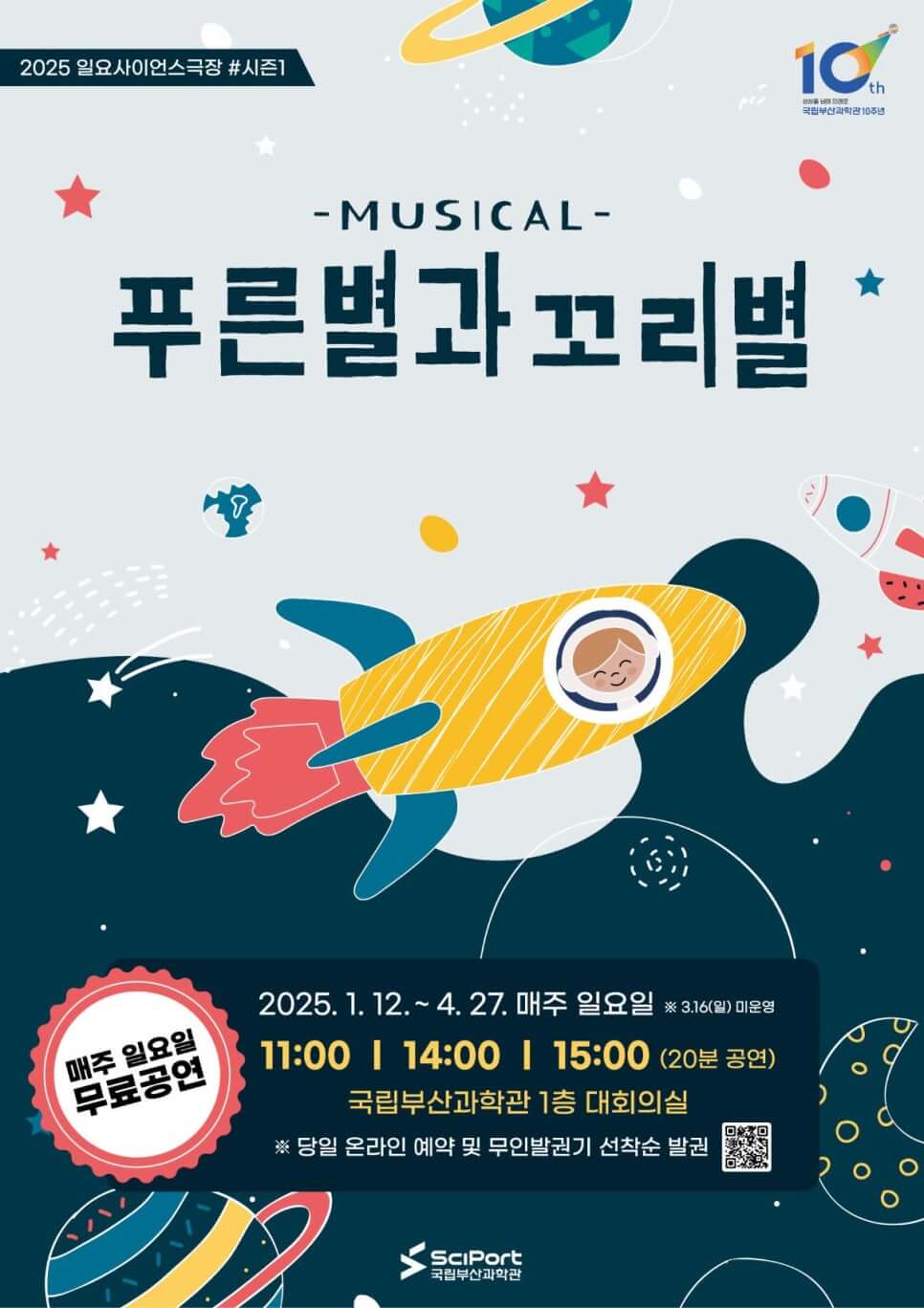 매주 일요일에는 과학 뮤지컬 ‘푸른별과 꼬리별’이 국립부산과학관 1층 대회의실에서 무료로 진행됩니다. 공연은 11시, 14시, 15시에 하루 3회 상영되며, 선착순 250명에게만 입장이 허용됩니다. 재미있는 이야기 속에 과학 원리를 자연스럽게 녹여내어 아이들이 쉽고 재미있게 과학을 배울 수 있습니다. 주말을 활용해 가족 모두 즐길 수 있는 공연입니다. 또한, 3월 주말에는 가족이 함께 참여할 수 있는 ‘숙박형 천문우주캠프’가 열립니다. 1박 2일 동안 별자리 관찰과 천문 실습을 통해 아이들이 우주와 천문학에 대한 관심을 키울 수 있는 기회입니다. 청소년 동반 2~5인 가족이 참여할 수 있으며, 참가비는 가족 구성원 수에 따라 다릅니다.