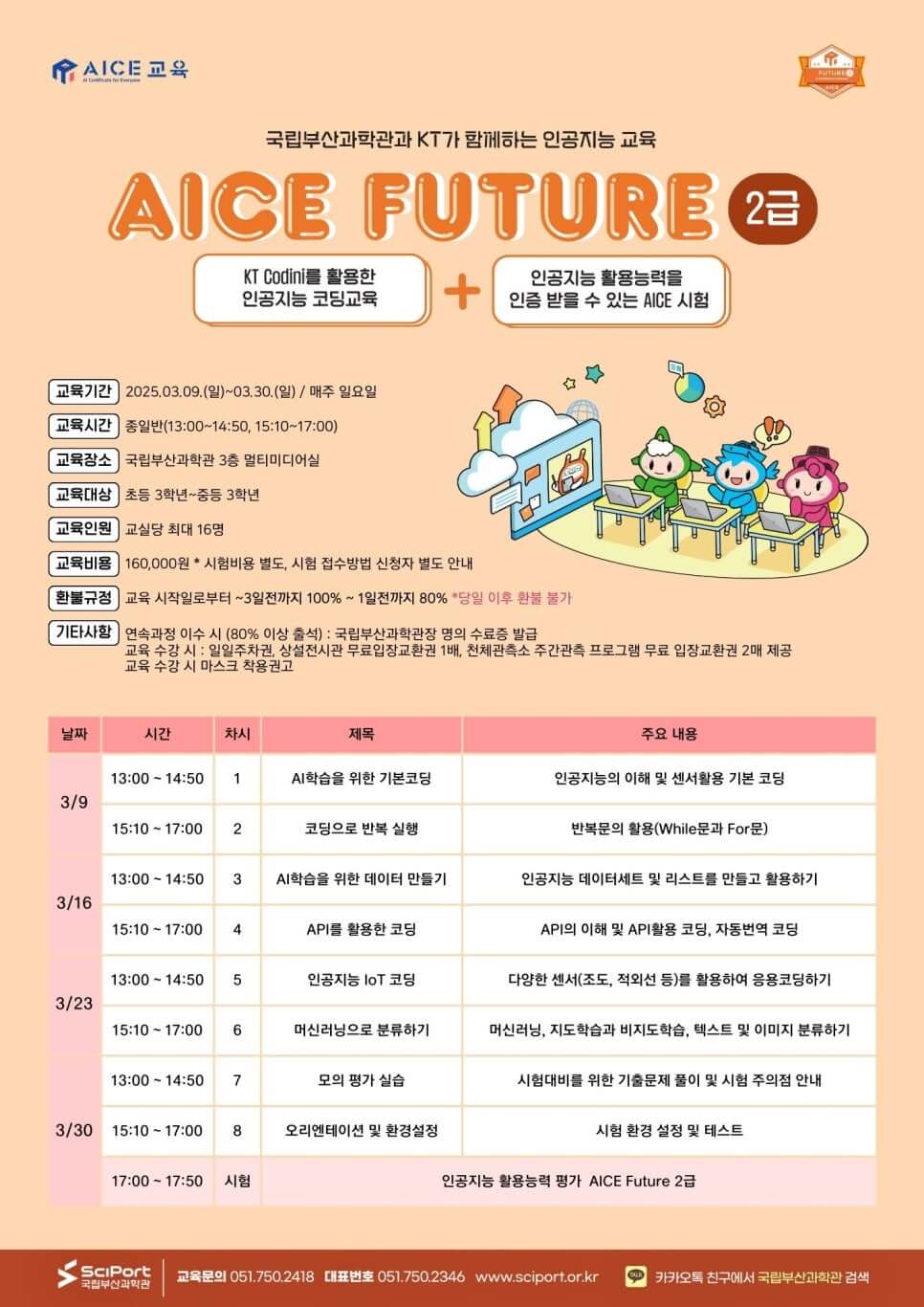 국립부산과학관에서는 봄학기 주말마다 유아, 초등, 중등 학생들을 위한 맞춤형 교육 프로그램이 진행됩니다. 과학 실험과 창의적 체험 활동을 통해 과학에 대한 흥미를 높이고, 사고력을 키울 수 있습니다. 또한, 인공지능(AI)에 관심 있는 학생들을 위한 ‘AICE FUTURE 2급’ 캠프도 3월 9일부터 30일까지 매주 일요일에 진행됩니다. AI 기초부터 실습까지 체계적으로 배우며, 미래 기술에 대한 이해도를 높일 수 있습니다. 참가 자격은 AICE FUTURE 3급을 취득한 초등 3학년부터 중등 3학년까지이며, 선착순 모집이니 빠른 신청이 필요합니다.