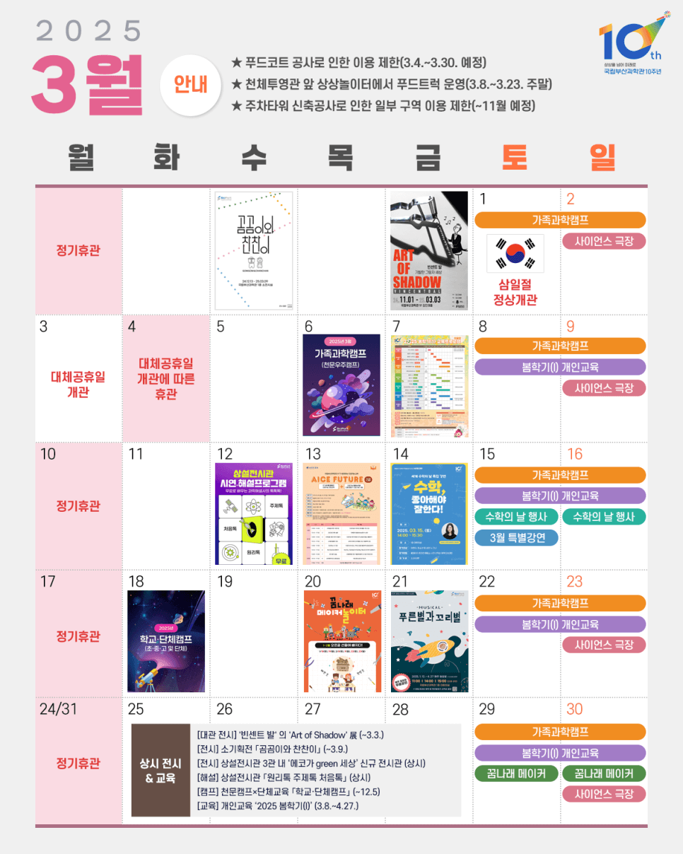 따뜻한 봄이 찾아오며 가족 나들이 계획을 세우고 있다면, 국립부산과학관이 완벽한 선택입니다. 특히 아이들과 함께라면 과학 체험을 통해 재미와 교육을 동시에 누릴 수 있어 더욱 매력적입니다. 3월에는 다채로운 전시와 교육 프로그램이 준비되어 있어 호기심 많은 아이들이 마음껏 상상력을 펼치며 배울 수 있습니다. 빈센트 발의 ‘Art of Shadow’ 특별 전시부터 수학 특별강연, 네온사인 만들기 메이커 놀이터까지 다양한 체험이 기다리고 있습니다. 과학관을 방문하면 단순한 나들이가 아닌, 배우고 느끼는 특별한 하루를 보낼 수 있습니다. 이번 포스팅에서는 3월 국립부산과학관의 주요 일정과 프로그램을 소개하며, 가족 나들이 계획에 도움을 드리겠습니다.