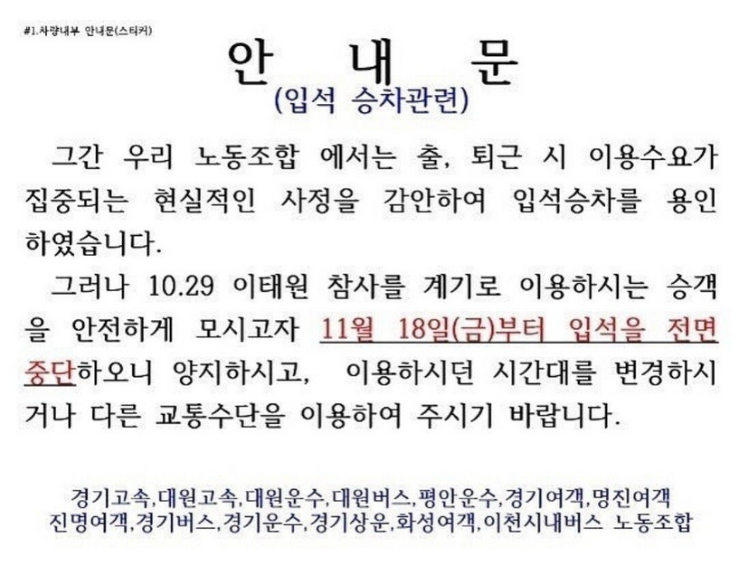 안전사고 이후에 특히나 안전과 관련된 업무를 하는 분들이라면 보다 민감하게 반응할 수밖에 없습니다. 이에 따라 경기고속, 대원고속, 대원버스 평안운수, 경기여객, 명진여객, 진명여객, 경기버스, 경기운수, 경기상운, 화성여객, 이천시내버스 노동조합에서는 입석 승차를 11월 18일 금요일부터 전면 중단한다고 밝혔기 때문에 출퇴근길 불편은 불보듯 뻔한 것 같습니다. 평소에 서서 출근을 하셨던 분들이라면 미리 대체 교통수단을 확인해두셨다가 이동하시기 바랍니다. 일부 지역에서는 이미 입석금지가 정착되었지만 수원, 화성, 용인 등 경기 남부권 대도시에서는 아직 완전 정착하지 않은 것으로 알려져 이 지역 서울 출퇴근 하시는 분들은 미리미리 반드시 꼭꼭 확인하시기 바랍니다.