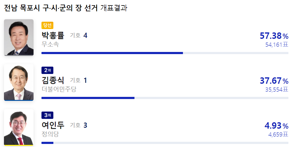 호남이나 영남지역은 한 개당에 대한 지지가 높은 편이지만 지방선거에서는 무소속 후보자가 당선되는 경우가 많이 나타납니다. 이번에 소개해드릴 목포의 경우 전직 현직 시장이 4년만에 재격돌을 벌였는데 승자는 공천을 받지 않은 박홍률 후보가 당선을 하였습니다. 치열할 것이라는 예상과는 달리 박홍률 후보가 54,161표로 57.38%의 지지를 더불어민주당 김종식 후보가 35,554표, 37.67%의 지지로 지난 패배를 설욕함과 동시에 4년을 건너 뛴 재선에 성공하게 되었습니다.