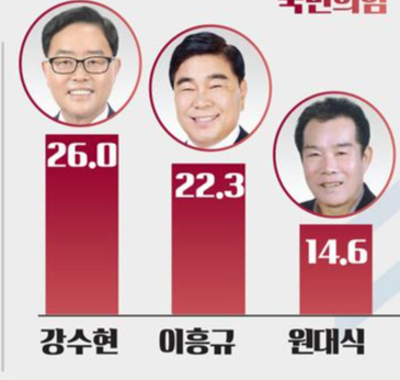 이런 기회가 흔히 오지 않기 때문에 국민의힘은 더욱 공천에 공을 들이고 있는 모습입니다. 지난 지방선거에서 거의 수도권에서는 전패를 하다시피 반면 국민의힘은 지난 지방선거에서 수도권 지역 단체장을 많이 잃었기 때문에 패한 선거구에서 공석이 된 양주는 기회의 땅이 될 수 있습니다. 초반에 무려 7명의 후보가 출마의사를 밝혔지만 결과적으로는 컷오프를 4명 시켜 3인 경선으로 압축되어 광역의원 출신 이흥규, 원대식 후보와 강수현 전 양주시 기획행정실장이 양주시장 자리를 놓고 싸우고 있으며. 강수현 부위원장 26%,