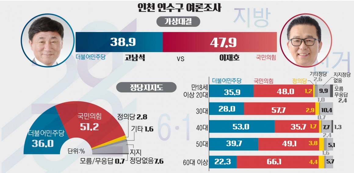 지난 대통령선거에서 연수구는 더불어민주당 이재명 후보가 111,446표, 국민의힘 윤석열 후보가 127,768표를 받아 이재명 후보가 44.5%, 윤석열 후보가 51.0%의 지지율을 받아 연수구는 상대적으로 선거 결과를 비추어 볼 때 국민의힘이 유리한 위치에 있는 것으로 판단됩니다. 이러한 분위기에 더해 이번 여론조사에서 실시한 후보 지지도 조사에서 국민의힘 이재호 후보가 47.9%, 더불어민주당 고남석 후보가 38.9%로 이재호 후보가 앞서나가고 있어 향후 진행되는 여론조사에서 추이를 지켜봐야 할 것으로 판단됩니다.