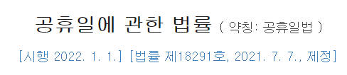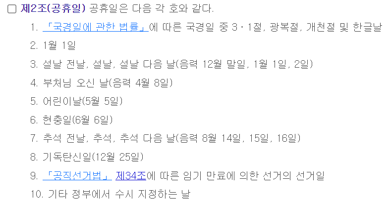 우선 국경일에 관한 법률에는 국경일을 보내는 기념일들을 나열하고 있는데 여기에 속한 국경일의 면면을 살펴보면, 삼일절, 광복절, 개천절, 한글날 등 중요한 국경일은 물론, 신정, 설 연휴(설 전일, 당일, 익일), 석가탄신일, 어린이날, 현충일, 추석 연휴(추선 전일, 당일, 익일)과 더불어 크리스마스까지 다양한 연휴를 포함하고 있으며 선거와 광련된 공직선거법상 임기 만료에 따른 선거일, 아울러 정부에서 지정하는 날과 주말에 다른 공휴일과 겹치는 경우에는 대체 공휴일을 지정할 수 있다고 규정하고 있어 작년에는 개천절 역시 대체공휴일로 적용되었고 돌아오는 한글날 역시 주말인 경우 대체공휴일 적용이 가능한 국경일입니다.