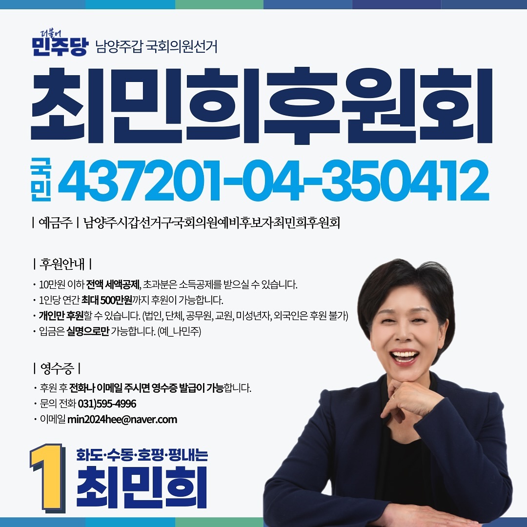 경기 남양주갑 지역구는 전통적으로 진보 정당이 강세를 보여왔습니다. 이 지역은 인구 증가와 도시 팽창으로 지난 제20대 국회의원 선거부터 갑·을·병 3개 선거구가 됐습니다. 현재 이 지역 현역은 개혁신당 조응천 의원입니다. 최민희 후보는 더불어민주당 국민소통위원장으로 활동하고 있으며, 그의 주요 활동은 다음과 같습니다. 최 후보는 민주당이 소상공인 전담은행을 추진 중이라며 소상공인의 금리부담 완화와 에너지 비용 지원 등 실효성있는 대책을 추진할 것이라고 밝혔습니다.