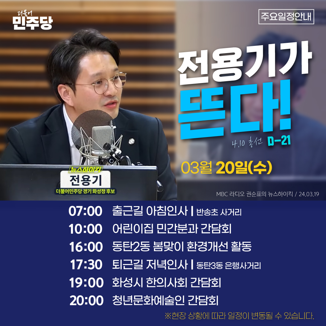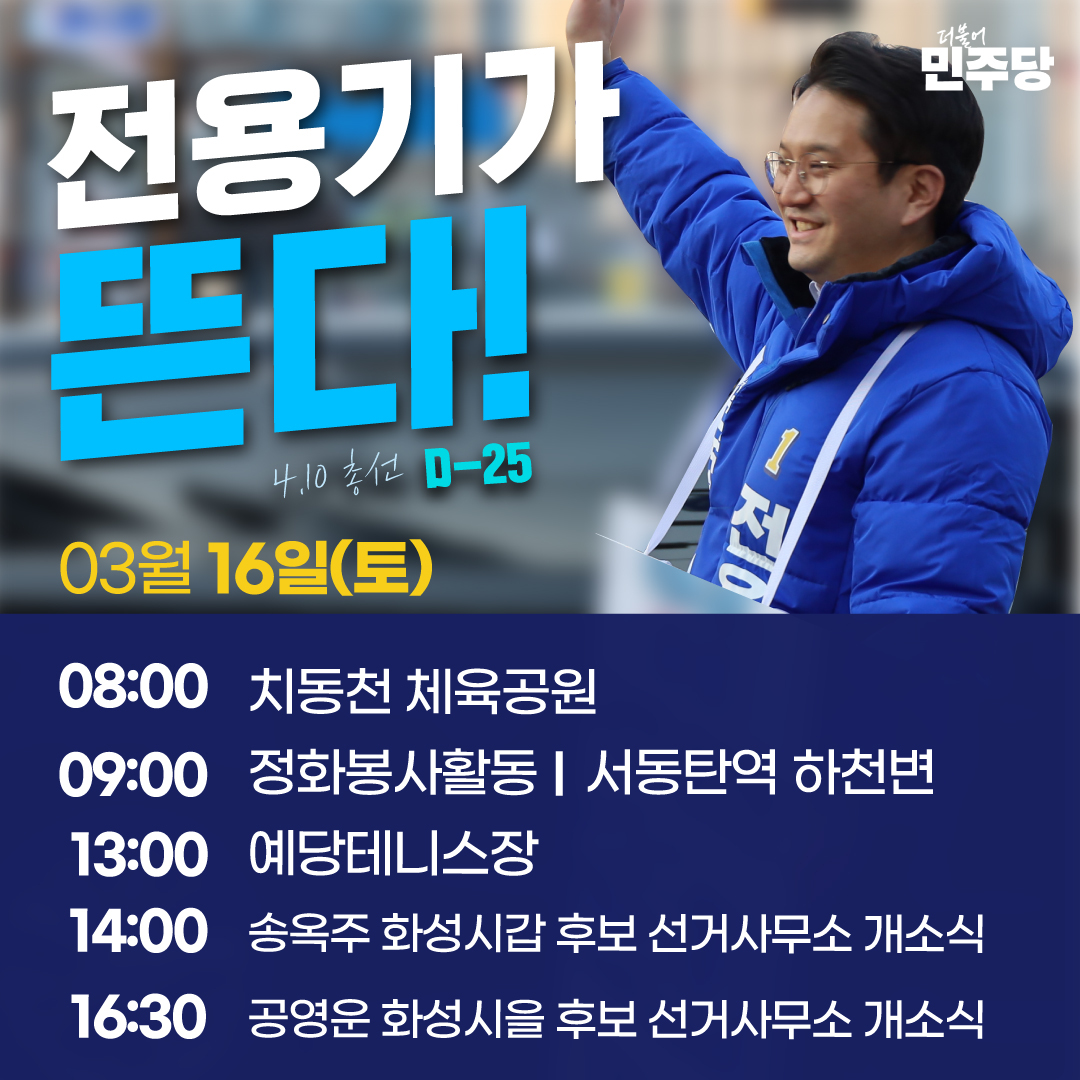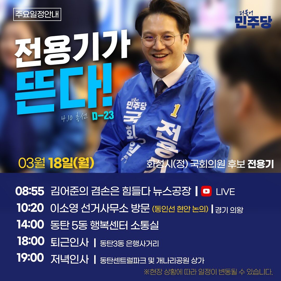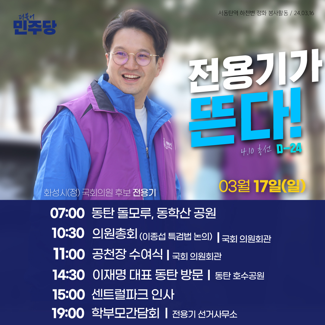 전용기 후보는 2024년 화성시 22대 총선에서 화성정 선거구의 더불어민주당 후보로 활동하고 있습니다. 그는 대학생 시절 삼성전자 동탄공장 건설현장에서 일하며 동탄과 첫 인연을 맺었고, 동탄신도시에 가정을 꾸리며 자리매김했습니다. 그는 21대 국회에 비례대표로 입성한 이후에도 꾸준히 지역사회 현안을 연구하고 주민들과 소통하며 '동탄 일꾼’이 되기 위한 준비를 해왔습니다.