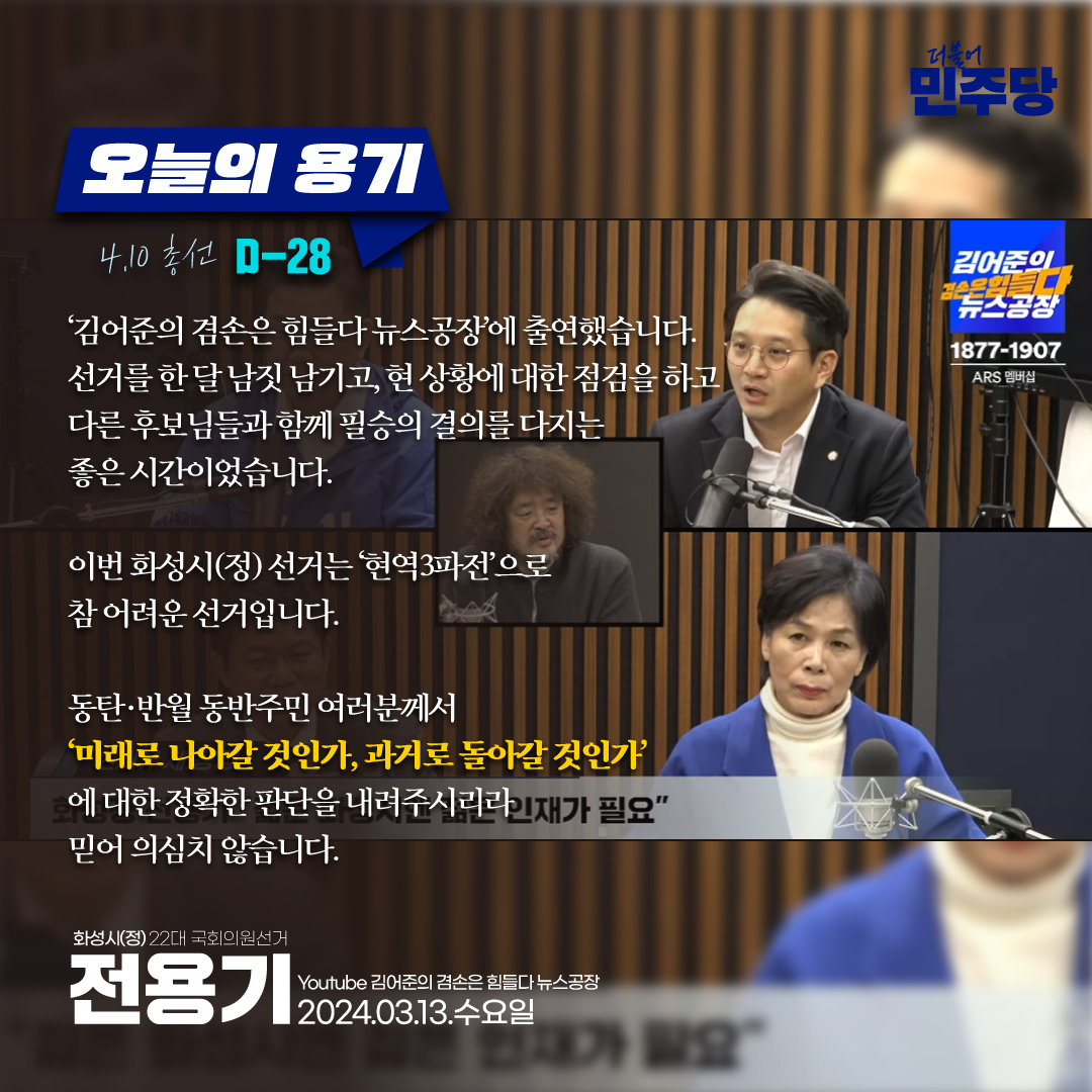그는 "동탄1신도시와 반월동 주민의 삶과 기본권에 관련한 문제를 해결하기 위해서는 빠르고 강력한 추진력을 가진 리더십, 젊은 정치인이 필요하다"며, "기성 정치인보다 10배는 더 기민하게 뛰어다니고, 빠릿빠릿하게 일할 준비가 되어 있다"고 밝혔습니다. 전용기 후보는 민주당 대학생위원장, 민주연구원 이사로 활동했으며, 현재 제21대 국회의원 (비례대표,환경노동위원회)이면서 더불어민주당 전국청년위원회 위원장입니다32. 이러한 경험을 바탕으로 그는 청년들의 목소리를 대변하고, 청년들이 직면한 문제를 해결하는데 힘쓰고 있습니다.