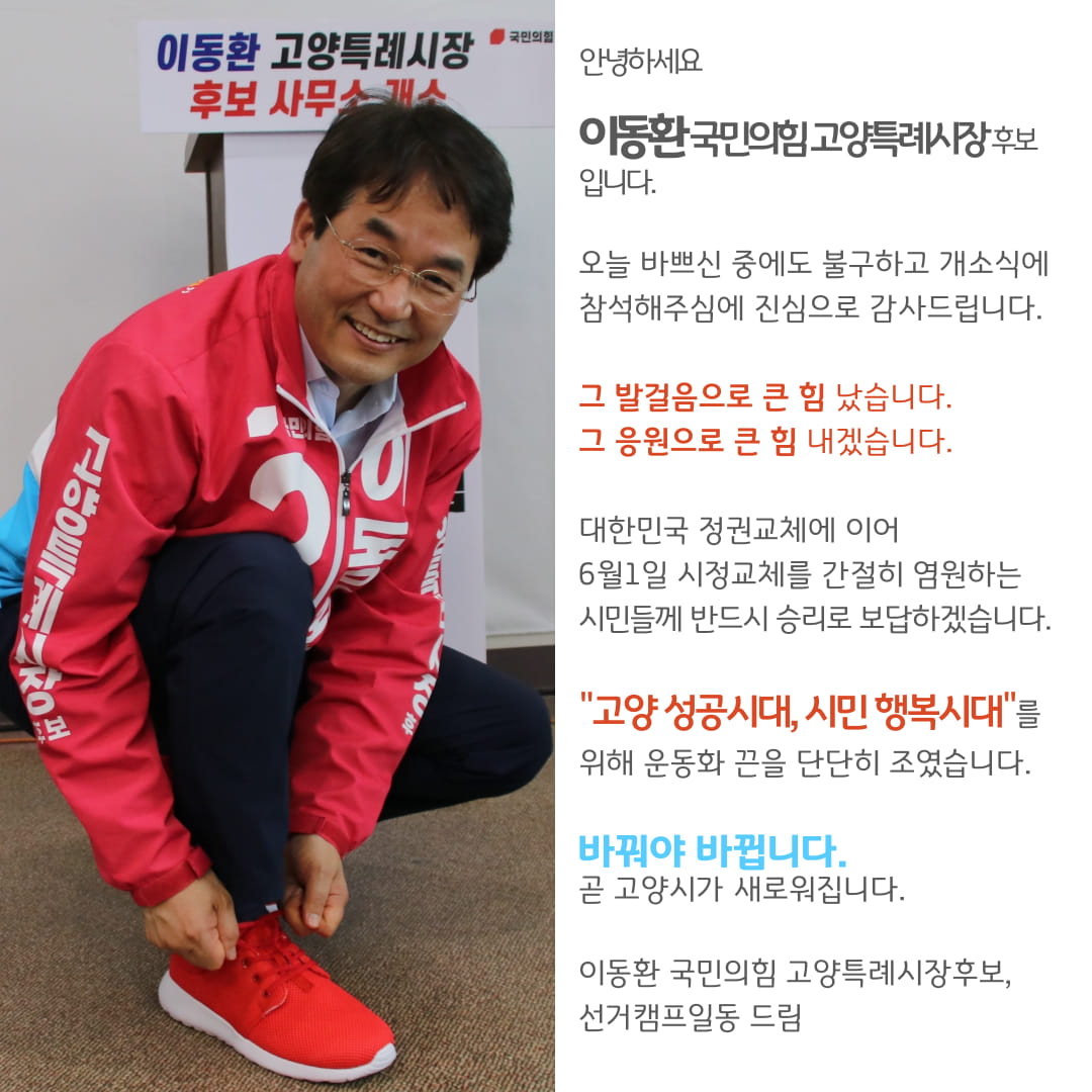 국회 보좌관 출신 이동환 후보는 주거환경연구원 연구실장, 연세대학교 도시공학과 연구교수, 고양시 의제21 운영위원장, 홍익대, 연세대학교 겸임교수 등을 역임 후 경기도지사 정무실장으로 보다 정치인으로 가까워졌으며 민선7기 고양시장 후보에 이어 이번 민선8기에도 고양시장에 도전하게 되었습니다.