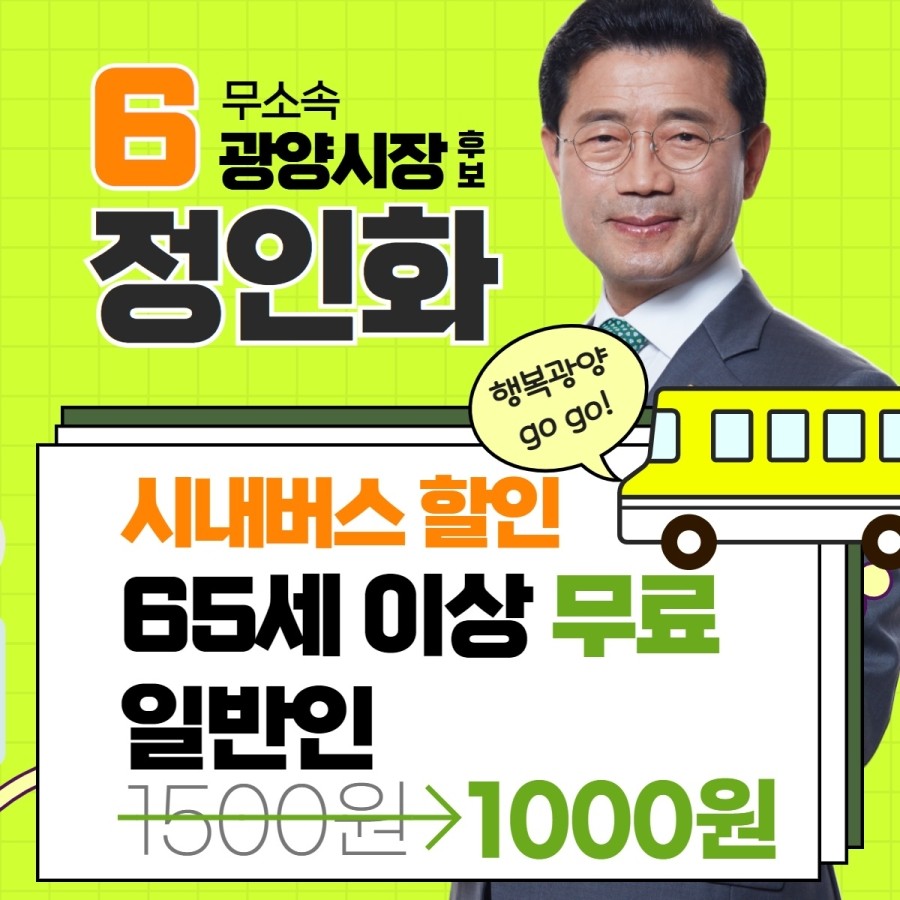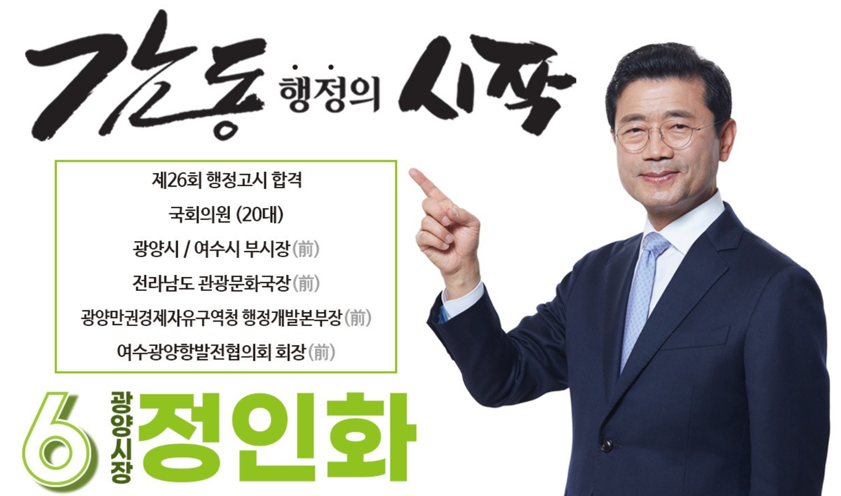 정인화 광양시장 당선인은 “감동 행정의 시작”이라는 슬로건으로 이번 선거에 임했으며 주요 공약으로는 중마동과 금호동을 연결하는 중금대교 건설, 초대형 이순신장군 동상 건립, 청년, 여성 일자리 확충, 태인동-금호동 간 인도교 가설, 광양읍 시계탑 사거리 로터리화 추진, 출산율 상승을 위한 출산,보육,교육 지원 공약, 청년 대책 공약, 생애주기별 맞춤형 복지 플랫폼 구축 등 열 일곱가지 구체적 공약을 제시하였으며 특히 65세 이상 시내버스 무료 탑승, 일반인 시내버스 요금 1000원으로 할인, 19세 이하 청소년 한 명당 100만원 긴급재난생활비 지급, 광양시민 20만원 지원 등이 큰 호응을 받은 것으로 알려졌습니다.