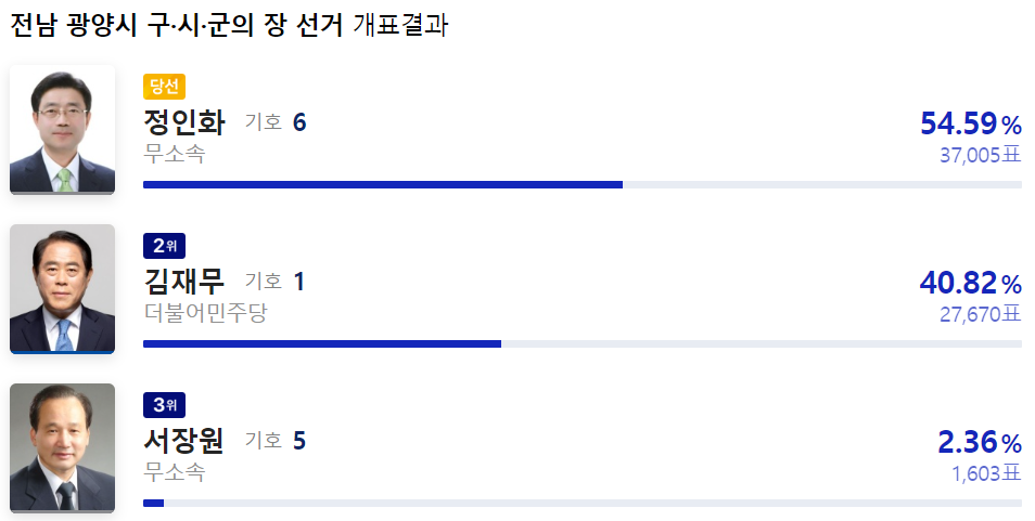 우리나라 지방으로 가서 정치지형을 살펴보면 지역마다 선호 정당이 꼭 하나씩은 있습니다. 하지만 지방선거는 그 결이 조금은 다른데 아무래도 지역의 일꾼을 뽑는 선거다보니 당의 간판을 보고 투표를 하는 것이 아니라 사람을 보는 경향이 조금 더 많습니다. 이번에 소개해드릴 광양의 경우 정현복 광양시장이 지방선거 출마 포기속에 더불어민주당과 무소속 후보 2명의 3인 구도로 진행되었는데 치열할 것이라는 예상과 달리 정인화 후보가 37,005표로 54.59%의 지지, 더불어민주당 김재무 후보 27,670표, 40.82%의 지지로 당선되었습니다.