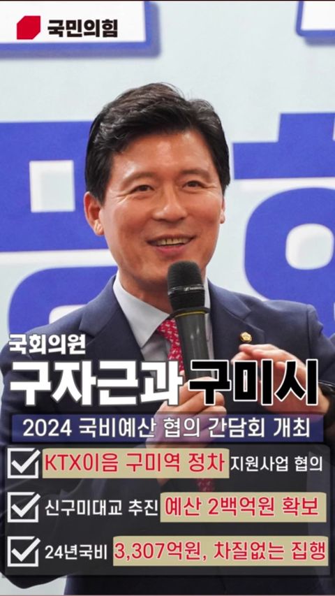 구자근 후보는 국민의힘 소속으로 경북 구미시를 지역구로 두고 있습니다. 그는 제21대 국회 의정활동을 통해 고향 구미 발전과 구미시민의 행복한 삶을 위해 이뤄낸 성과들을 발표하였습니다. 그는 '사통팔달 구미’를 현실화하고 있습니다. 남부내륙철도 (구미~거제)와 구미~문경 철도 건설사업을 본격화하였고, 사업이 원활히 추진될 수 있도록 매년 충분한 예산을 확보하였습니다. 또한, 구미를 중심으로 서울 수서와 경남 거제를 잇는 가칭 중부선 건설사업이 본격화되고 있습니다.
