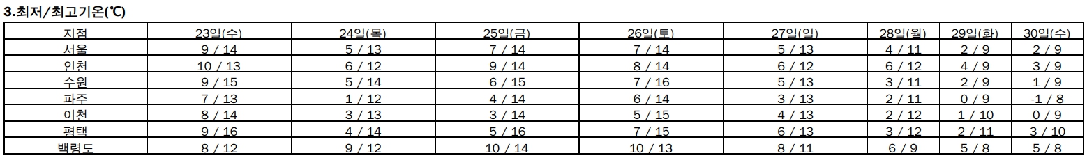 지역별로 최저 최고 기온을 살펴보면 서울이 23일 수요일(최저/최고) 9~14도, 24일 목요일 5~13도, 25일 7~14도, 인천은 23일 수요일 10~13도, 24일 목요일은 10~13도, 25일은 9~14도, 수원은 23일 수요일 9~15도, 24일 목요일 5~14도, 25일 금요일 6~14도의 분포로 다음 주는 대체적으로 춥지는 않아 늦가을의 마지막 정취를 느끼기에 괜찮을 것으로 보입니다.
