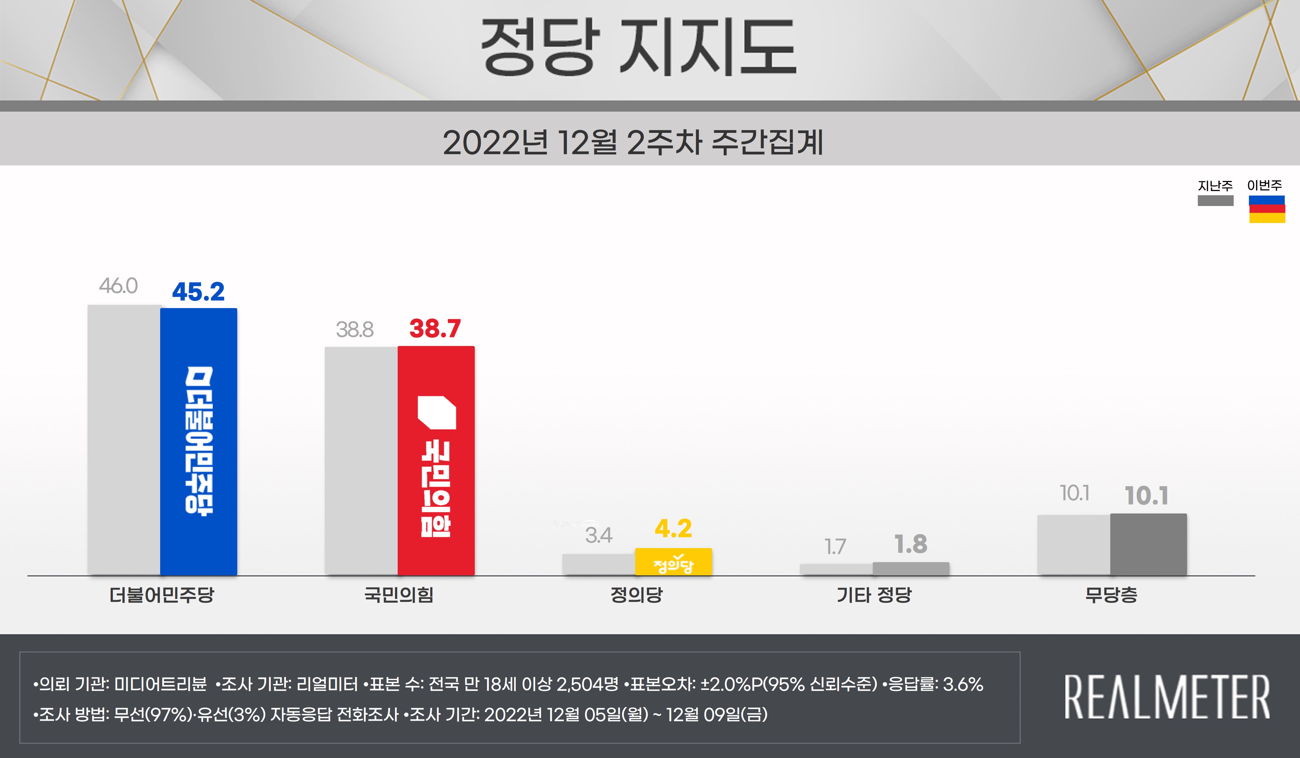 결국 정당 지지율은 각 정당이 국회에서 어떠한 모습을 보이느냐에 따라 다르게 나타나는데 야당인 더불어민주당은 이상민 행안부 장관 해임건의안을 단독처리함과 동시에 정부가 추진한 화물연대 파업 종료와 상반된 안전운임제 3년 연장 추진 등은 지지율 답보의 원인으로 보이며 국민의힘 역시 큰틀에서는 국회에서 여소라는 한계가 있음을 인정하면서도 큰 역할을 하지 못하고 있기 때문에 지금과 같은 지지율 답보가 양당 모두에게 있어 보여 더불어민주당은 지난 주보다 소폭 하락하여 45.2%, 국민의힘 역시 지난 주보다 소폭하락한 38.7%를 기록하였습니다.