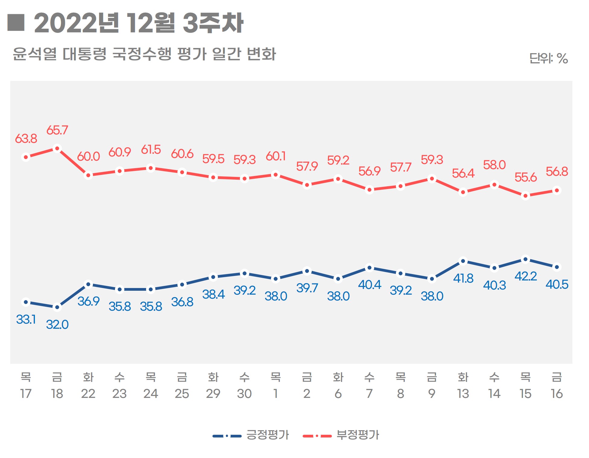대통령 지지율 및 정당 지지율 리얼미터 여론조사 결과(12월 2주차) 전국적인 총파업으로 국가 동맥인 물류를 인질로 정부와 협상에 나섰던 화물연대의 꿈이 윤석열 정부의 강력한 대처로 유야