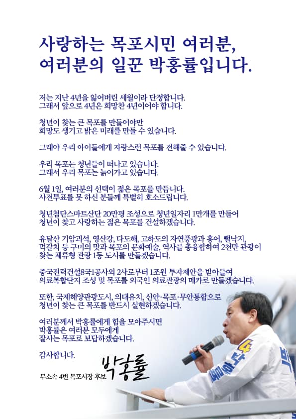 박홍률 당선인은 위대하고 현명하신 목포시민 모두의 승리라며 시민들에게 다시 선택을 받은 데에 감사인사를 우선으로 깨끗한 시정 소통행정으로 목포의 밝은 미래를 열어가겠다며 시정에 대한 의지를 보여주었으며 갈라진 지역 민심을 통합하여 민주적 시정을 추진하겠다고 시정방침에 대해 이야기 하였습니다.