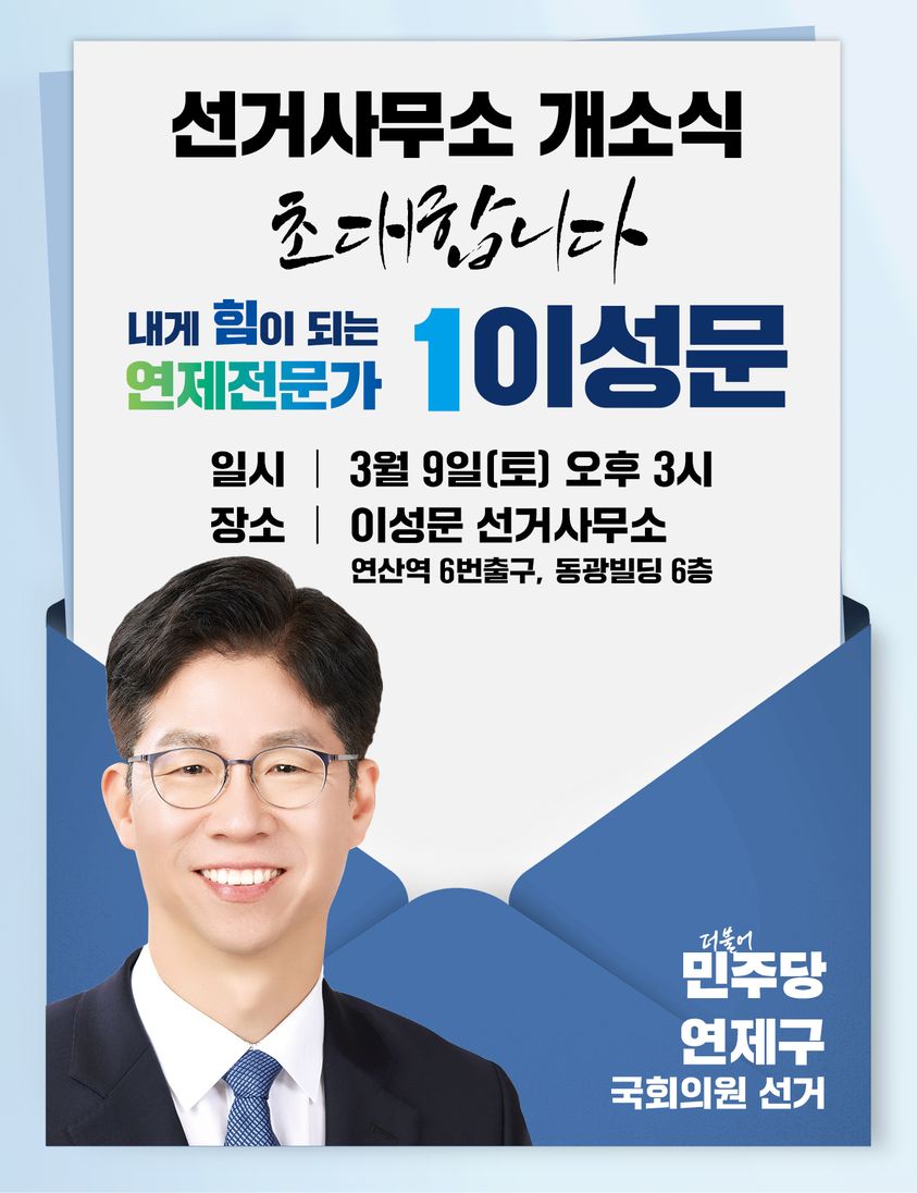 이성문 후보는 “두 아이를 키우며 변호사 일을 하고 평범한 일상을 누리며 살 수 있었으나 우리 대한민국과 부산 그리고 연제구가 처한 현실을 가만히 지켜보고 있을 수만은 없었다”면서 “부산은 갈수록 쇠퇴해 가고 있고, 연제구 역시 가지고 있는 기회요인을 제대로 발현하지 못하고 있기 때문에 정치가 제 역할을 해야한다고 생각한다.” 라고 말했습니다