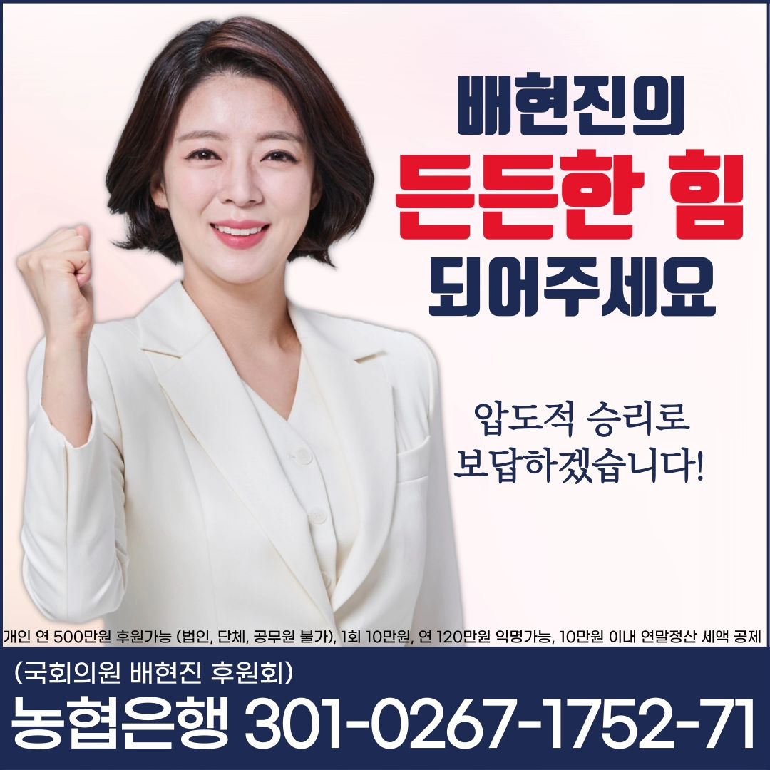 배현진(裵賢鎭, 1983년 11월 6일 ~)은 대한민국의 전직 MBC 아나운서 출신 정치인으로, 국민의힘 소속 제21대 국회의원입니다. 그녀는 충청남도 예산에서 태어나, 녹양초등학교, 대흥중학교, 안상동산고등학교를 졸업한 후 한양대 ERICA를 중퇴하고, 숙명여대에서 국어국문학과 정보방송학 학사를, 북한대학원 대학교에서 북한학 석사과정을 수료하였습니다. 2008년 11월 MBC 공채 아나운서로 입사하여 7년간 활동하였으며, 2018년 3월 자유한국당 대표 홍준표에 의해 영입되었습니다5. 2020년 제21대 총선에서 미래통합당 후보로 서울 송파구을에 당선되었습니다