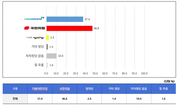 거대 양당이 양강 구도를 가진 상태에서 진보당 장지화 후보를 더해 실시한 이번 여론조사에서는 국민의힘 신상진 후보가 49.2%, 더불어민주당 배국환 후보 37.9%로 오차범위 밖에서 국민의힘 신상진 후보가 앞서는 것으로 나타났습니다. 거기에 더해 정당 지지도에서 역시 국민의힘이 46.8%, 더불어민주당이 37.4%로 각각 앞서는 것으로 나타나 국민의힘 입장에서는 오랜만의 성남시정을 탈환할 기회를 더불어민주당 입장에서는 시장직을 빼앗길 위기에 몰리고 있어 선거기간 중 치열한 캠페인이 진행될 것으로 예상됩니다.