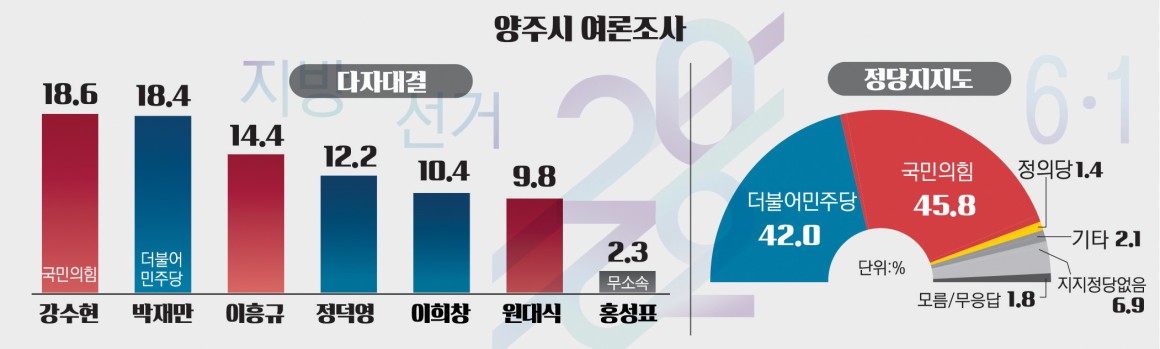 현직 시장이던 이성호 양주시장이 건강 문제로 시정 공백이 생기는 데에 대한 부담감이 있다보니 결국 임기를 얼마남기지 않고 퇴임을 결정하였는데 이러한 결정이 이번 지방선거에 더불어민주당에게는 부담이 될 수도 있다는 느낌입니다. 현직 프리미엄이 있던 양주지만 어쨌든 공석이 되어버린 양주는 더불어민주당은 정성호 국회의원 정책특보 출신 박재만 전 경기도의원, 정덕영 양주시의회 의장, 이희창 전 의장이 대결을 벌이고 있으며 이번 조사에서 실시한 적합도 조사에서는 박재만 전 경기도의회 도시환경위원장 23.6%, 정덕영 양주시의회 의장이 22.5%, 그 뒤를 이희창 전 의장이 17.8%로 뒤를 쫓고 있습니다.