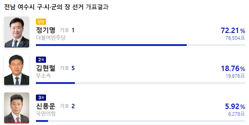 호남 지역에서는 사실 더불어민주당계가 정치적으로 탄탄한 지지세를 보이는 것이 사실입니다. 하지만 지방자치단체장과 지방의회를 선출하는 지방선거에서는 당세와 무관한 결과 또한 나오는 것도 사실입니다. 정당의 공천을 받아 선거 캠페인을 치르는 것이 여러면에서 유리하지만 무소속 후보도 상당히 선전을 하는 것이 바로 지방선거의 매력이 아닐까 싶습니다. 를 받는 경우가 상당히 많습니다. 하지만 이번에 소개해드릴 여수시에서는 압도적 당세를 바탕으로 더불어민주당 소속 정기명 후보가 76,504표로 72.21%로 무소속 후보와 국민의힘 후보를 넉넉히 꺽으며 여수시장직에 오르게 되었습니다.