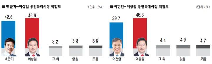 이번 여론조사에서는 국민의힘 이상일 후보와 경선을 진행 중인 백군기, 이건한 후보에 대한 적합도 조사를 실시하였는데 두 후보 대상으로 모두 국민의힘 후보인 이상일 후보가 백군기 후보를 상대로는 46.6% 대 42.6%로, 이건한 후보에 대해서는 46.3%대 39.7%로 앞서고 있는 것으로 나타났습니다.
