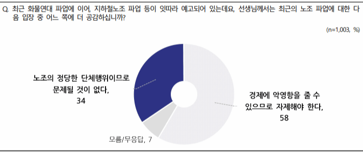 최근 화물연대, 지하철 노조, 철도 노조, 전에는 버스 파업까지 일반 시민들의 일상에 밀접한 분야에서 일하는 사람들의 파업이 연일 이어지고 있습니다. 이에 대해 국민들은 자제해야한다는 응답이 58%, 노조의 정당한 단체행위로 문제될 것이 없다는 의견이 34%로 나타나 정치 성향을 떠나서 일반 시민의 생업이 위협될 수 있는 범위의 파업은 다소 지양할 필요가 있지 않나 싶습니다.
