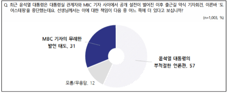 대통령이 되면서 소통을 위해 매일같이 해오던 도어스테핑이 중단되었는데 이에 대해 대통령의 부적절한 언론관때문이라는 의견이 57%, MBC 기자의 무례한 발언 태도가 31%로 윤석열 대통령의 부적절한 언론관을 뽑았으나 예상대로 진보층에서는 대통령의 책임이 반대로 보수층에서는 기자의 무례한 태도를 꼽는 의견이 높은 것으로 나타났습니다.