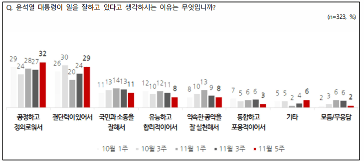 엠브레인퍼블릭, 케이스탯리서치, 코리아리서치, 한국리서치 등이 지난 11월 28일부터 30일까지 3일간 만 18세 이상 남녀 1,003명을 대상으로 휴대전화 가상번호(100%)를 이용한 전화면접조사를 토대로 윤석열 대통령 지지율 등을 조사하였으며 이번 포스팅에서 다루지 않은 사항은 중앙선거여론조사심의위원회 홈페이지를 참고하시기 바랍니다.