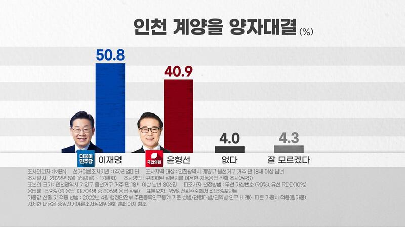 MBN 주관으로 리얼미터가 실시한 지난 여론조사는 5월 16일에서 5월 17일 사이 인천 계양구 거주 만 18세 이상 남녀 806명을 대상으로 무선 가상번호 90%, 유선RDD 10% 비율로 구조화된 설문지를 이용한 ARS 전화 조사 방식으로 진행한 결과 더불어민주당 이재명 후보가 50.8%, 국민의힘 윤형선 후보가 40.9%로 지난 선거의 20% 차이에서 10%차이로 많이 좁히고 있는 결과를 받아들었습니다.
