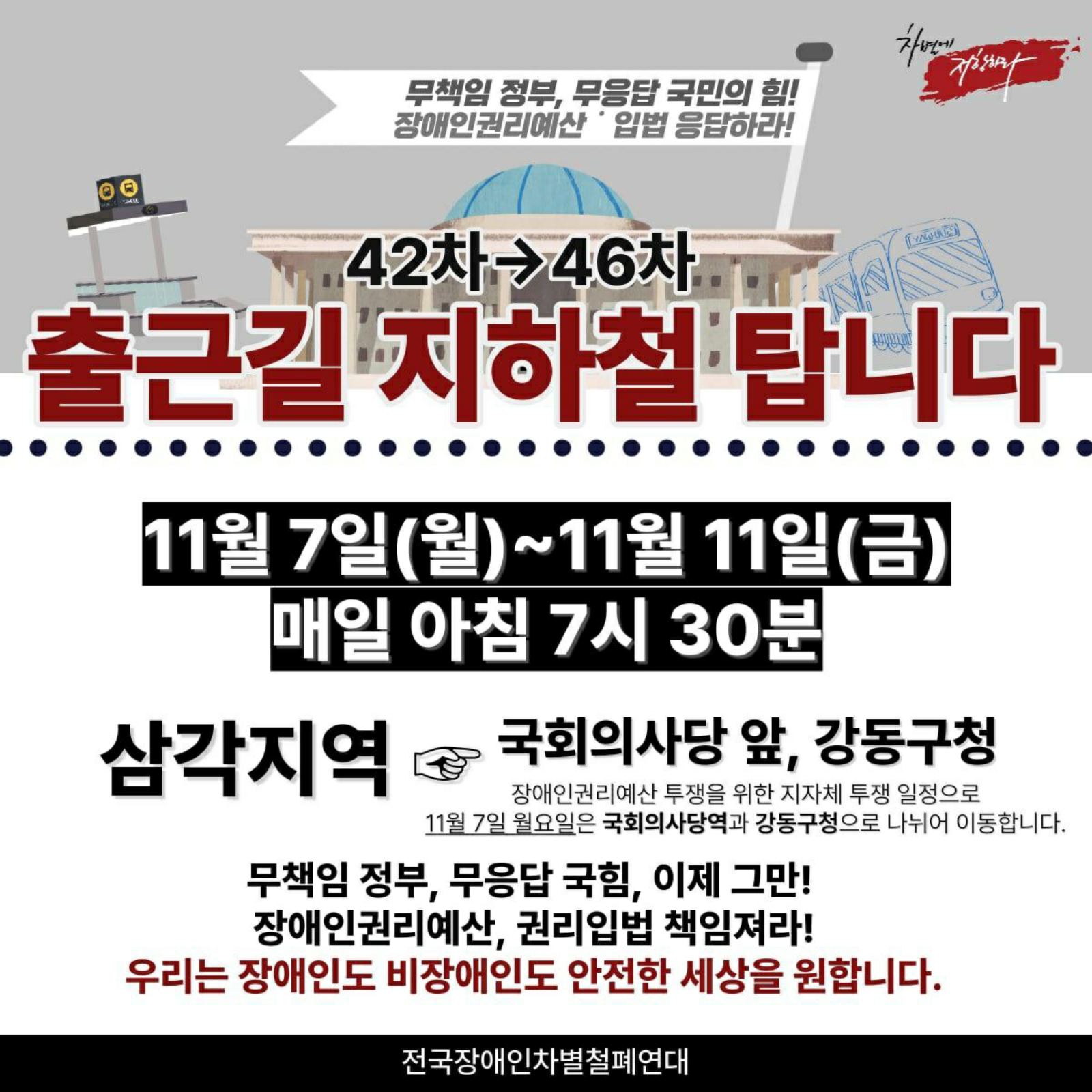 가뜩이나 이태원 사고에서 사람들이 넘쳐나며 사고가 발생하여 지하철역 승강장과 내부 역시 아비규환이나 다름없는 가운데 이러한 시위가 이어지면 사람들이 모일 수밖에 없지만 공권력은 그저 볼 수밖에 없는 상황이다 보니 내 출근길은 내가 지켜야 겠습니다. 이번주 전장연 출근길 잘 참고하셔서 출근길을 지키시기 바랍니다.