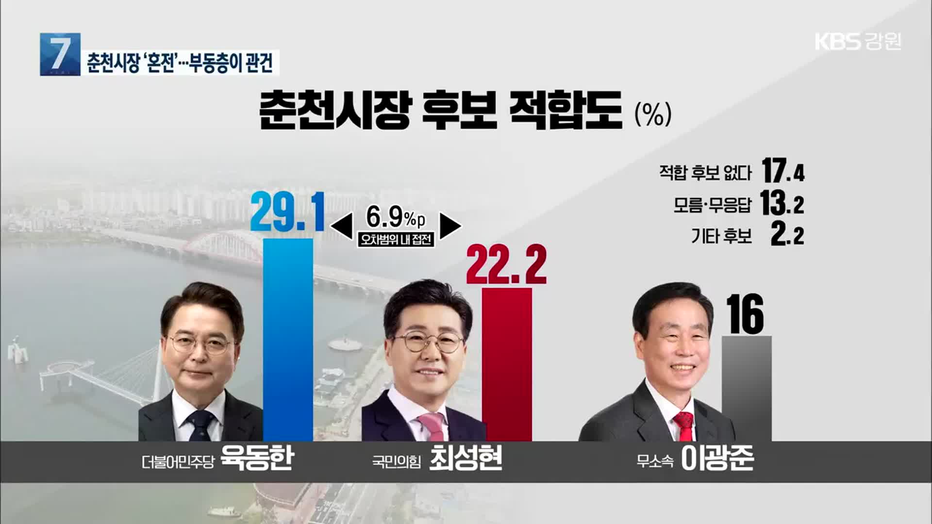 더불어민주당, 국민의힘, 무소속 후보인 3파전이 치열하게 실시될 춘천시장 선거 여론조사에서는 더불어민주당 육동한 후보 29.1%, 국민의힘 최성현 후보는 22.2%, 무소속 이광준 후보 16%로 삼자가 치열한 여론조사 결과가 나왔습니다. 비록 경선에 대한 이해관계가 다르지만 보수진영이 단일화를 선택한다거나 한다면 여론이 요동치기에 향후 후보자들간 협상이 진행될 수 있는지 조금 지켜봐야 할 것으로 보입니다.