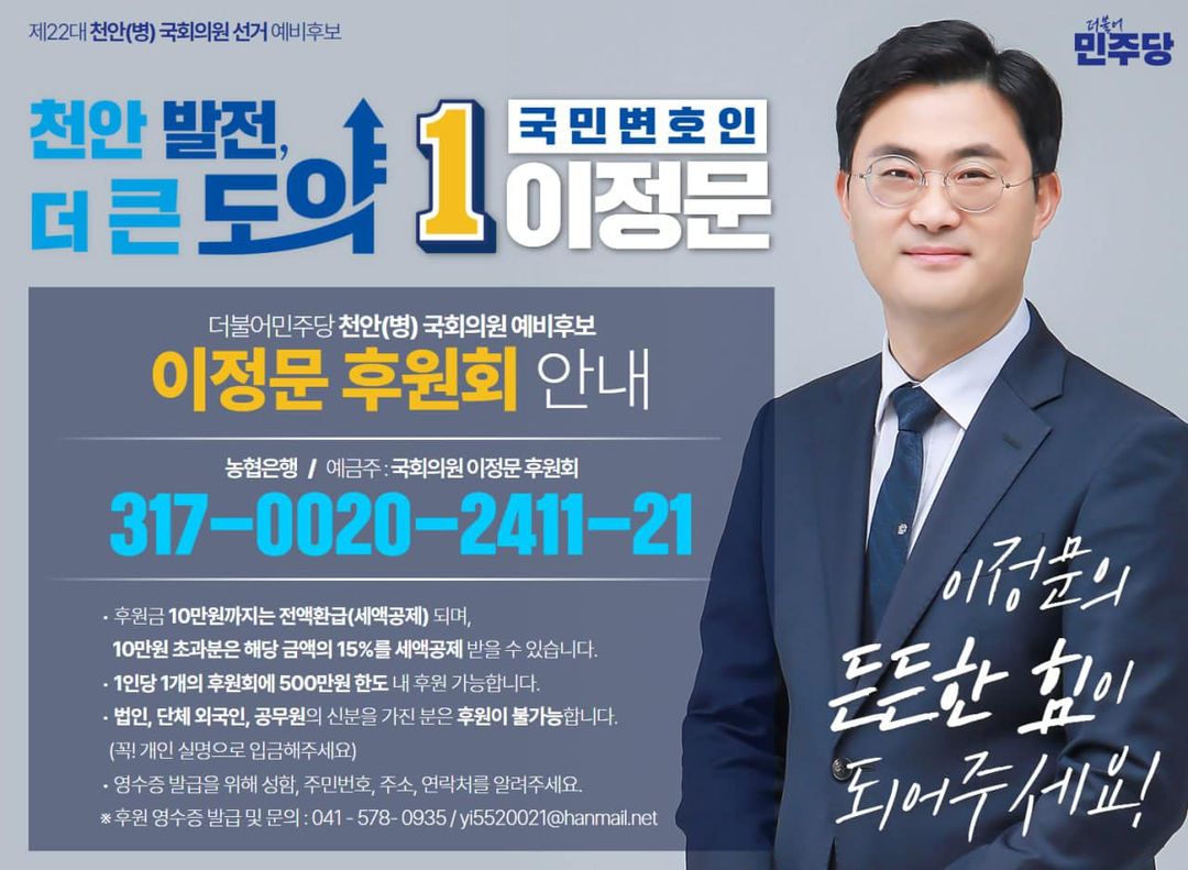 충남 천안시병 더불어민주당 국회의원 후보 이정문 프로필 자세히 알아보기