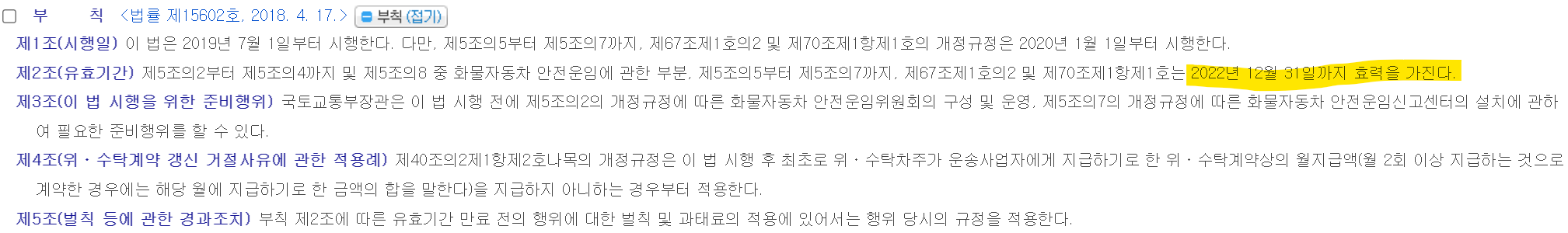 2018년 화물자동차 운수사업법 개정을 통해 만들어진 안전운임제 화물 차주 즉 화물 기사들에게 적정한 운임의 보장을 위해 만들어진 제도로 납기를 맞추기 위해 과로한 상태로 과적과 과속을 하는 기사들의 근무여건을 개선하고 안전한 사회를 만들기 위해 개정되었지만 20년부터 3년간 시행 후에 올해말 일몰될 예정입니다.