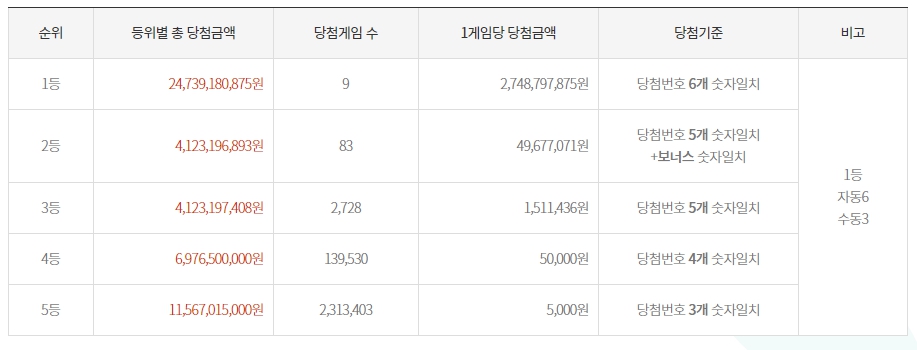 ▶1등 당첨금 - 1등 당첨자는 9명으로 각각 27억 4879만원