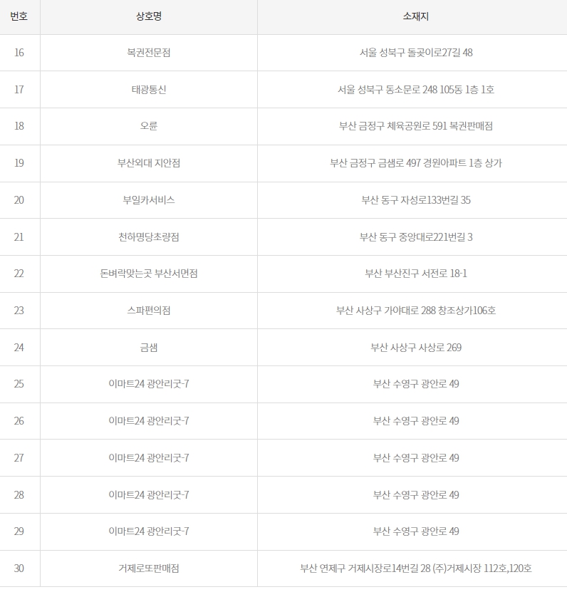 30 거제로또판매점 부산 연제구 거제시장로14번길 28 (주)거제시장 112호,120호